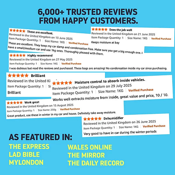 Professional heavy duty 1KG car dehumidifier with convenient dashboard mounting anti-slip mat prevents windscreen condensation, damp and moisture build-up effectively. Powerful 975g DMF free reusable silica gel absorbs up to 400ml moisture capacity, keeping windscreens, mirrors and glass completely condensation-free.
